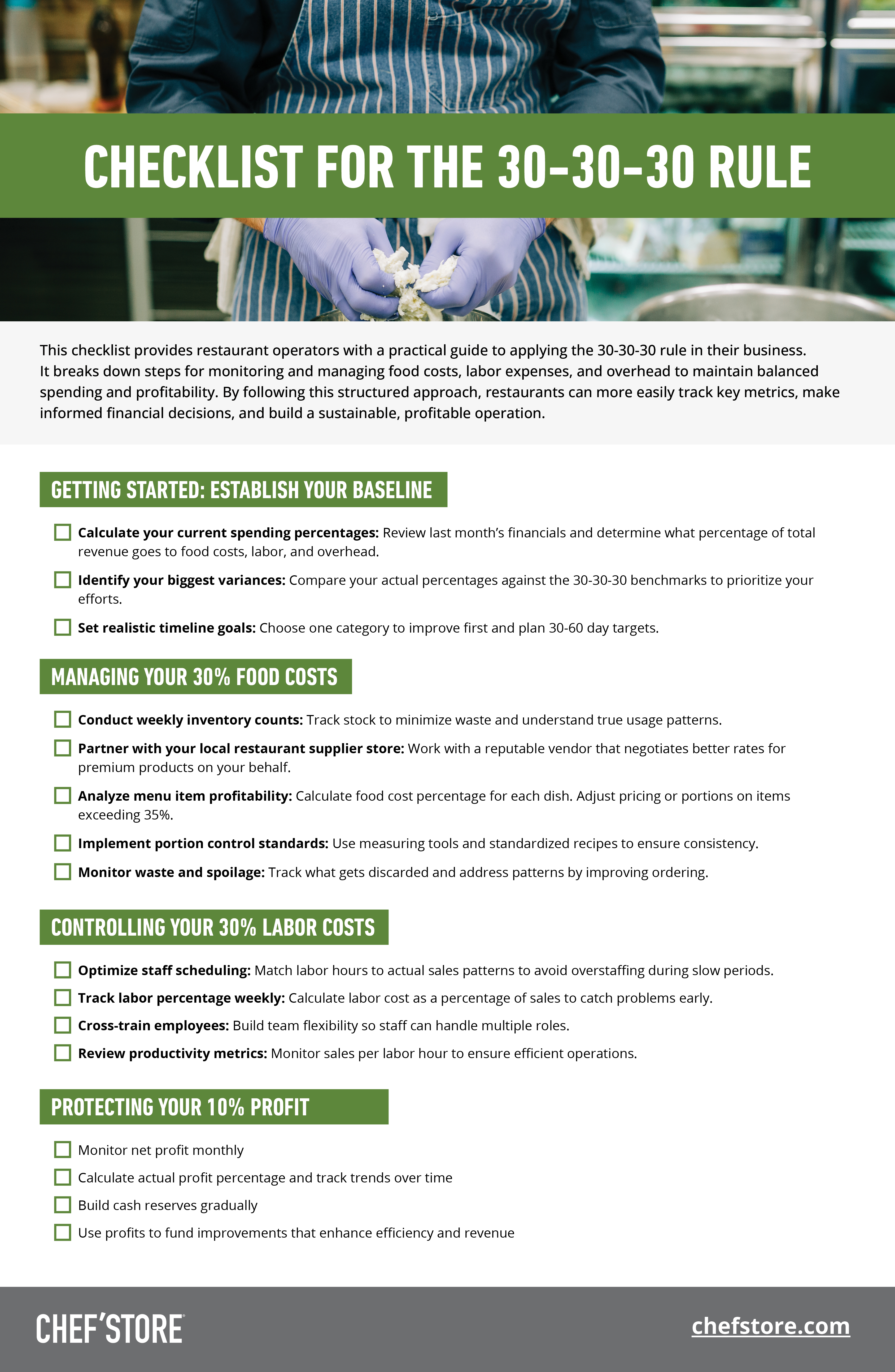 The 30-30-30 rule (sometimes called the 30/30/30/10 rule) is a budgeting guideline that allocates your restaurant's revenue across four key categories: